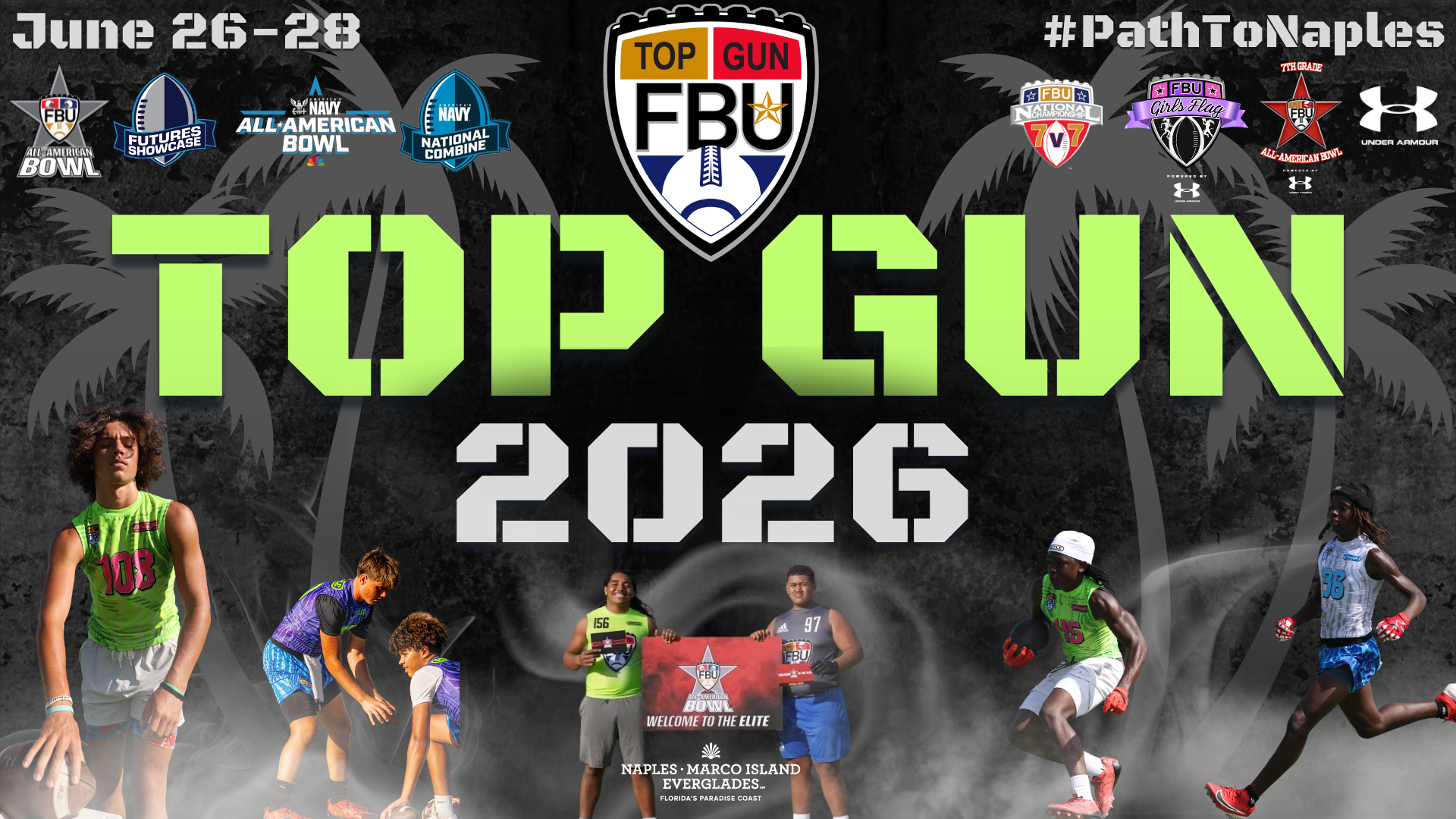Held annually at the Paradise Coast Sports Complex in Naples, FL, the FBU Top Gun Showcase is a three-day invite-only showcase for the best athletes from our regional camps. Combine testing, 1on1s 5on5s and 7on7s are all on the itinerary for this fast-paced, one-of-a-kind showcase. The largest of its kind, the Top Gun Showcase will feature thousands of athletes across the 2033-2027 grad classes. Athletes at this showcase will be eligible for invites to the following events:
