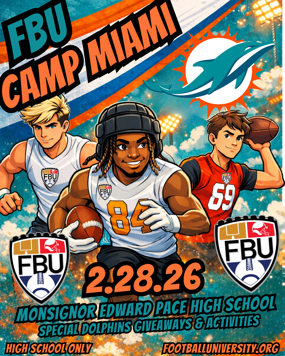 For the first time, FBU has partnered with a professional football team as the Miami Dolphins will join us on February 28th at Monsignor Edward Pace High School. This meet former players, current staff members, and receive exclusive giveaways from the Dolphins at this High School Only event. This event is open to all current athletes in the classes of 2029-2027. You can register by clicking the button below.