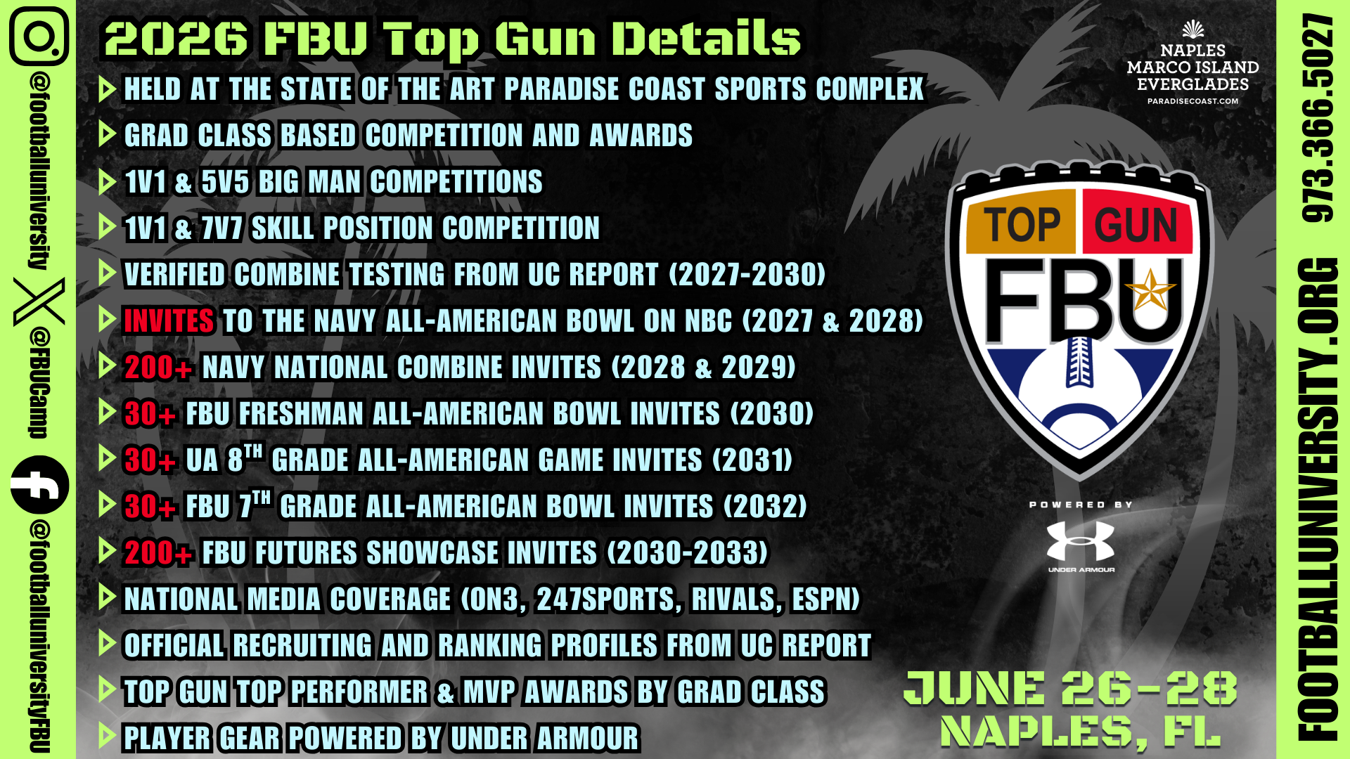 Held annually at the Paradise Coast Sports Complex in Naples, FL, the FBU Top Gun Showcase is an invitational showcase for the top 1500+ student-athletes from across the country.